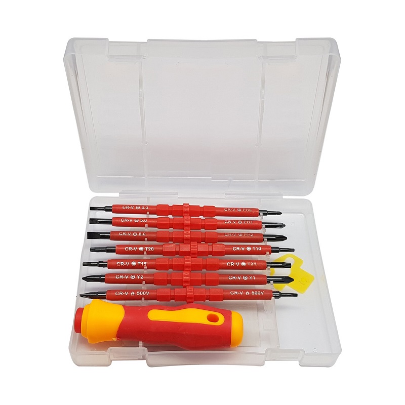 پیچ گوشتی یکی از پر مصرف ترین ابزار های ساده الکترونیکی است . از پیچ گوشتی برای باز و بسته کردن پیچ ها استفاده می شود. ست پیچ گوشتی 8 تایی با دسته عایق دارای یک دسته و 7 سری مختلف بوده که هر کدام دارای دو سر هستند , شما با خرید این ست پیچ گوشتی از یک پیچ گوشتی با 14 سری سری مختلف بهره مند می شوید , عایق بودن میله های این ست پیچ گوشتی خطر برق گرفتگی در اثر برخورد دست با بدنه پیچ گوشتی را کاهش می دهد. این ست پیچ گوشتی دارای سه سری دو سو , سه سری چهار سو در سایز های 3 و 5 و 6 میلی متر می باشد. همیچنین این ست دارای سری های موبایلی ستاره ای T10 T15 T20 T25 نیز می باشد. این ست 8 تایی پیچ گوشتی دارای سری های سه گوش Y1 و Y2 و یک سری مثلثی 2.6 و همچنین یک سری U شکل 2.3 نیز می باشد.