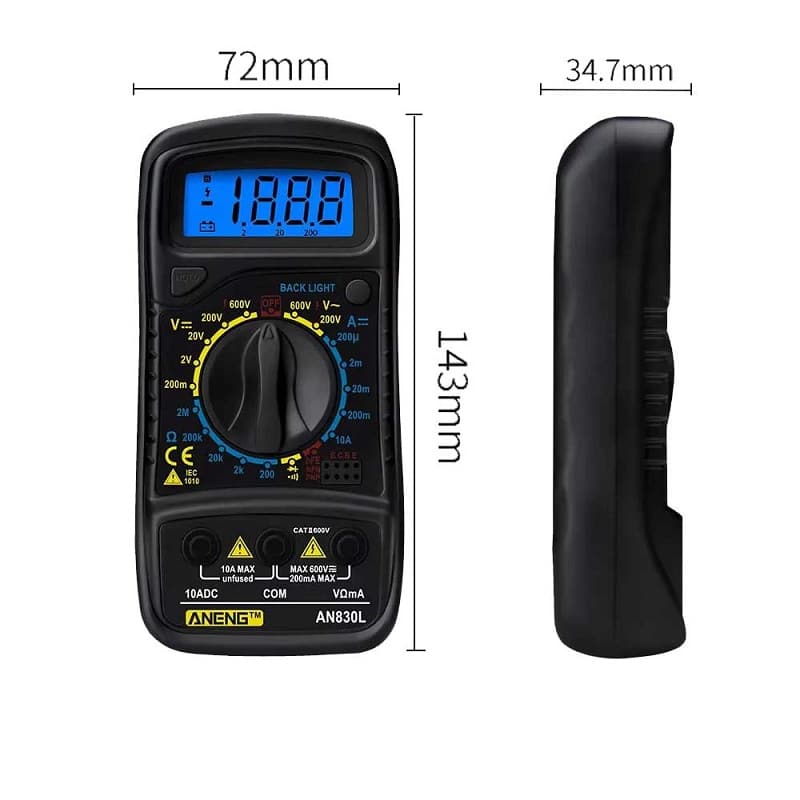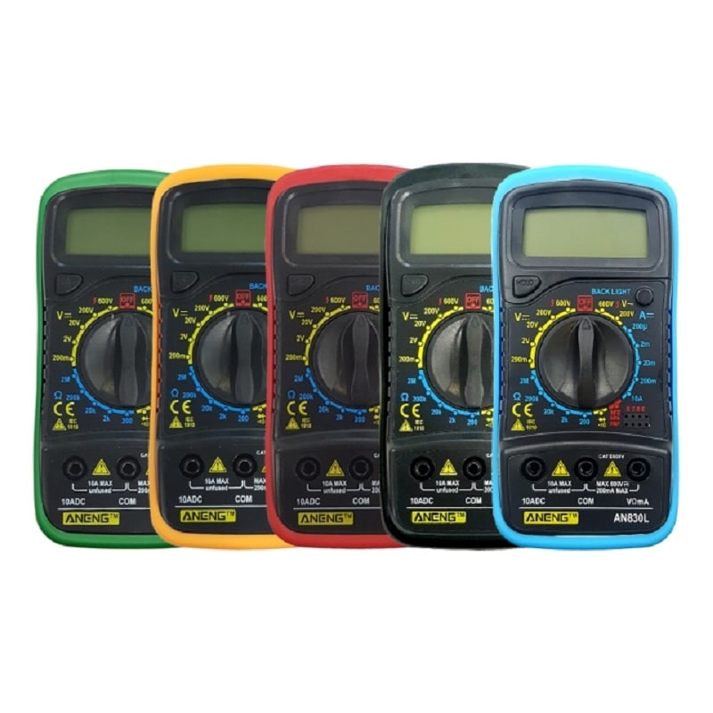 مولتی‌ متر دیجیتالی ANENG AN830L یک ابزار چندمنظوره، اقتصادی و قابل‌اعتماد برای اندازه‌گیری دقیق ولتاژ AC/DC، جریان DC، مقاومت، تست دیود و اتصال کوتاه است که با طراحی ارگونومیک، وزن سبک، و صفحه‌نمایش بزرگ با نور پس‌زمینه آبی، تجربه‌ای راحت و کارآمد را برای کاربران فراهم می‌کند.